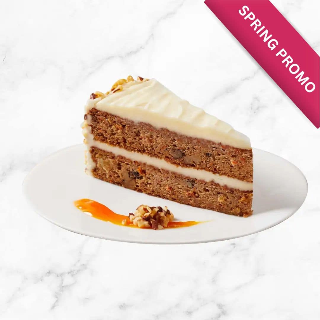 Order our SPRING PROMO Classic homemade carrot cake made with pineapple, shredded coconut, and pecans, topped with a rich cream cheese icing and toasted almonds on the side.
