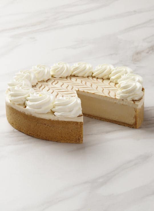 Creamy caramel cheesecake baked on a vanilla crumb and topped with caramel swirled mousse and whipped cream rosettes. $75.00