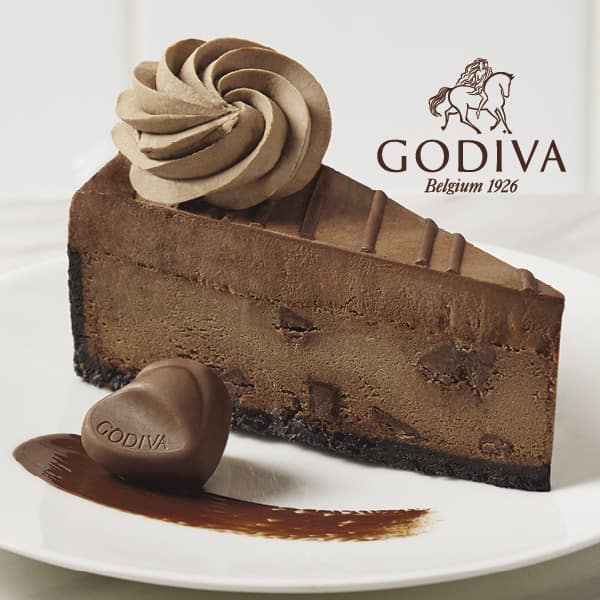 Rich Godiva® cheesecake baked with chunks of milk chocolate topped with chocolate mousse, chocolate ganache and chocolate whip cream.